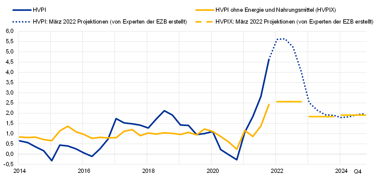 Quellen: Eurostat, EZB-Berechnungen und von Experten der EZB erstellte gesamtwirtschaftliche Projektionen vom März 2022. |