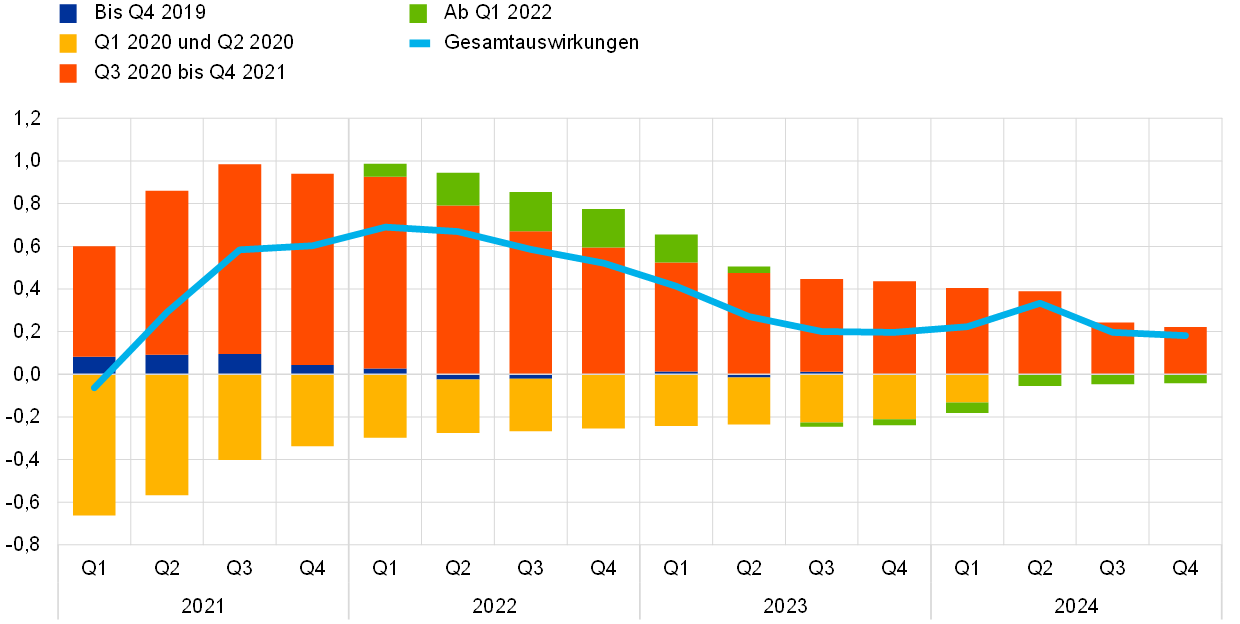 Anmerkung: Die anhand einer Reihe von Modellen geschätzten Auswirkungen beziehen sich auf den Durchschnittswert aus einer Reihe von Modellen, die das Eurosystem für geldpolitische Simulationen verwendet, einem Bayesianischen Vektorautoregressionsmodell (M. Rostagno, C. Altavilla, G. Carboni, W. Lemke, R. Motto und A. Saint Guilhem, Combining negative rates, forward guidance and asset purchases: identification and impacts of the ECB’s unconventional policies, Working Paper Series der EZB, Nr. 2564, 2021), dem NAWM-II-Modell und dem BASE-Modell der EZB.