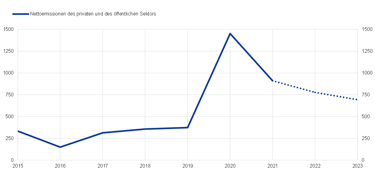 Anmerkung: Die gepunktete Linie zeigt die von Experten der EZB erstellten Projektionen zur Emission von Anleihen des öffentlichen Sektors und des Sektors der nichtfinanziellen Kapitalgesellschaften sowie Projektionen der Europäischen Bankenaufsichtsbehörde (EBA) für (unbesicherte) Wertpapiere des Bankensektors. Die letzte Angabe bezieht sich auf den 18. März 2022.