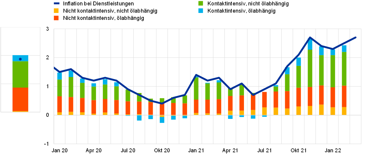Dass die Kerninflation aktuell über dem Trend liegt, ist in erheblichem Umfang auf die indirekten Auswirkungen der hohen Energiepreise und auch auf die globalen Engpässe zurückzuführen, wobei alle Sektoren vom Energieschock betroffen sind. Abbildung 19 zeigt, dass rund 70 Basispunkte der Kerninflation dem Energieschock zuzuschreiben sind. Aus den Abbildungen 20 und 21 geht hervor, dass sowohl die Inflation bei den Industrieerzeugnissen ohne Energie (non-energy industrial goods – NEIG) als auch die Teuerung bei den Dienstleistungen erheblich vom Ölpreisschock beeinflusst wurden. Die über den EMI-Angebotsindikator näherungsweise ermittelten Auswirkungen von Engpässen übertrugen sich ebenfalls spürbar auf die Inflation bei den Industrieerzeugnissen ohne Energie.