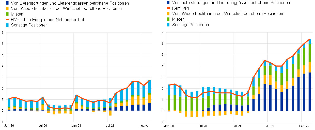 Angesichts von Energiepreisen, die im Februar 2022 30 % höher waren als im Februar 2021, ist die hohe Inflationsrate vor allem auf den Energiepreisschock zurückzuführen. Dies liegt daran, dass die Energiepreise unmittelbar in den Gesamtpreisindex einfließen und sich in allen Wirtschaftssektoren indirekt auf die Kosten auswirken. Doch selbst wenn die Energiepreise, bei denen in der Vergangenheit in beträchtlichem Umfang eine Rückkehr zum Mittelwert in kurzer Frist zu beobachten war, in der Nähe ihres aktuellen Niveaus bleiben, fällt die Auswirkung der Niveauverschiebung auf die Inflation im Zeitverlauf automatisch aus der Inflationsberechnung heraus. Ebenso sollten die mit Engpässen verbundenen relativen Preisverwerfungen bzw. Missverhältnisse zwischen Angebot und Nachfrage nachlassen, wenn zusätzliches Angebot verfügbar wird und sich der Nachfrageschub in den Sektoren normalisiert.[11]