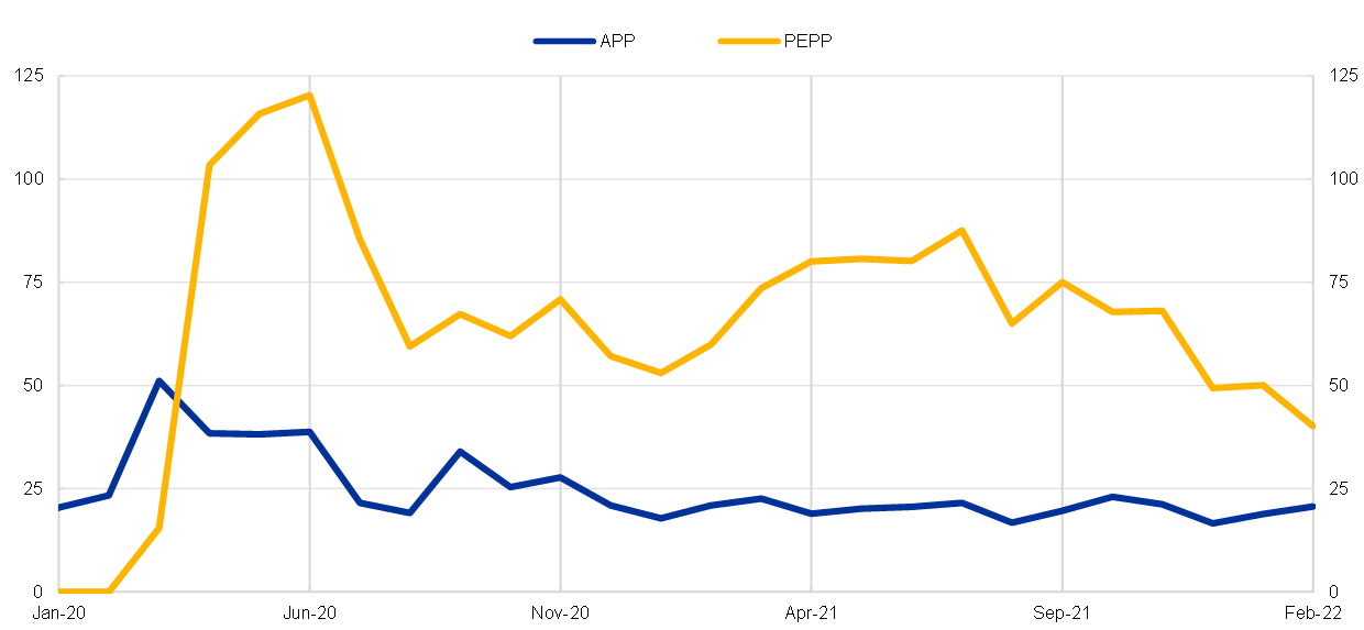 Anmerkung: Buchwert der monatlichen Nettoankäufe zum Monatsende. Die letzten Angaben beziehen sich auf Februar 2022.