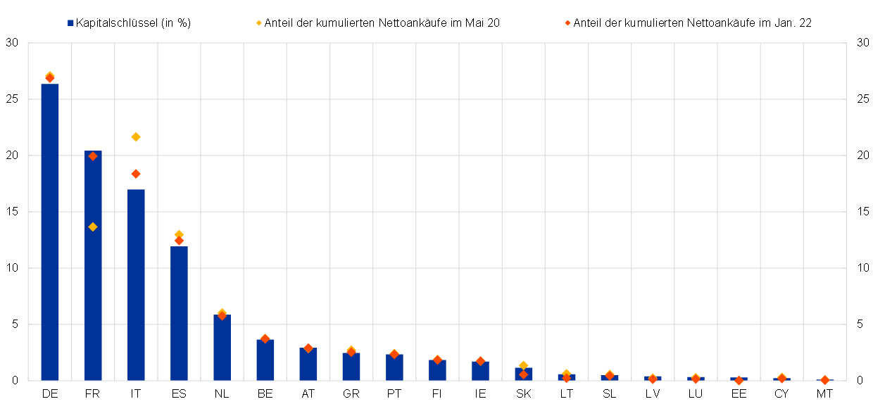 Anmerkung: Die Abbildung zeigt die kumulierten Nettoankäufe je Land im Rahmen des PEPP als Anteil der kumulierten Gesamtnettoankäufe von Wertpapieren des öffentlichen Sektors im Rahmen des PEPP (ausschließlich supranationaler Wertpapiere) im Mai 2020 und Januar 2022 im Vergleich zum EZB-Kapitalschlüssel. Die letzten Angaben beziehen sich auf Januar 2022.