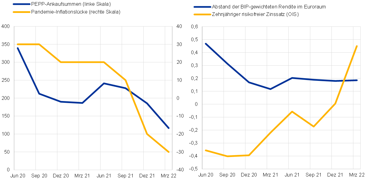 Wie die linke Grafik von Abbildung 9 zeigt, hatte die Verringerung der Pandemie-Inflationslücke (d. h. der Differenz zwischen der Inflationsrate, die in den Projektionen vom Dezember 2019 vor der Pandemie für das Ende des Projektionszeitraums projiziert wurde, und der jüngsten für das Ende des Projektionszeitraums projizierten Inflationsrate) eine gegenläufige Wirkung. Die Projektionen vom Dezember 2020 waren bereits von einer leichten Verringerung der Lücke ausgegangen (die für das Ende des Projektionszeitraums projizierte Inflationsrate stieg von 1,3 % auf 1,4 %). Die Verbesserungen in den Projektionsrunden im September 2021 und Dezember 2021 (Anstieg auf 1,5 % bzw. 1,8 %) sprachen dann dafür, das Ankaufvolumen im letzten Quartal 2021 und im ersten Quartal 2022 deutlicher zu reduzieren.