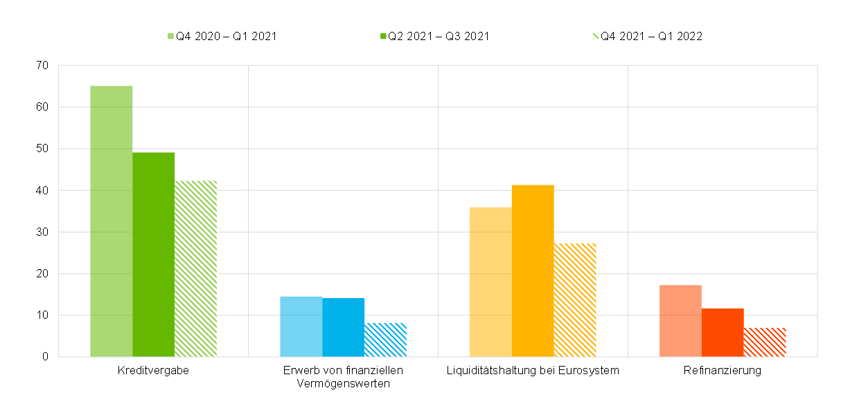 Anmerkung: Die Banken waren aufgefordert, die Relevanz der verschiedenen Verwendungszwecke anzugeben, wobei Mehrfachnennungen möglich waren. „Erwerb von finanziellen Vermögenswerten“ ist der Durchschnitt aus “Erwerb von inländischen Staatsanleihen“ und „Erwerb sonstiger finanzieller Vermögenswerte“. „Kreditvergabe“ bezieht sich auf Kredite an den nichtfinanziellen privaten Sektor. Der letzte Zeitraum betrifft Erwartungen, die die Banken in der BLS-Umfrage im Oktober 2021 angegeben haben. Die letzten Beobachtungen beziehen sich auf das dritte Quartal 2021.