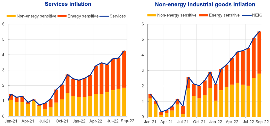 Note: il termine “componente sensibile all’energia” indica le voci contraddistinte da una quota di costi energetici diretti superiore alla media nel comparto dei servizi (grafico di sinistra) e in quello dei beni industriali non energetici (grafico di destra). Le ultime osservazioni si riferiscono a settembre 2022.