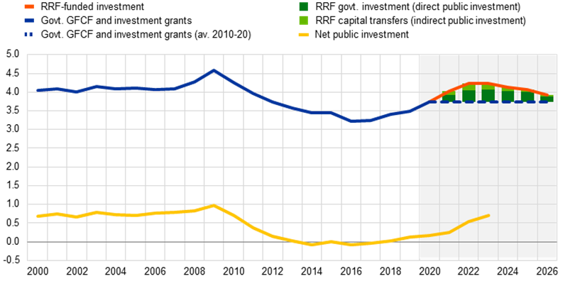 Notes: RRF stands for “Recovery and Resilience Facility”. “RRF-funded investment” includes both government investment (direct public investment - dark green bars) and capital transfers to the private sector (indirect public investment - light green bars). GFCF stands for “gross fixed capital formation” in national accounts. The public investment-to-GDP ratio (blue lines) includes government GFCF and investment grants.