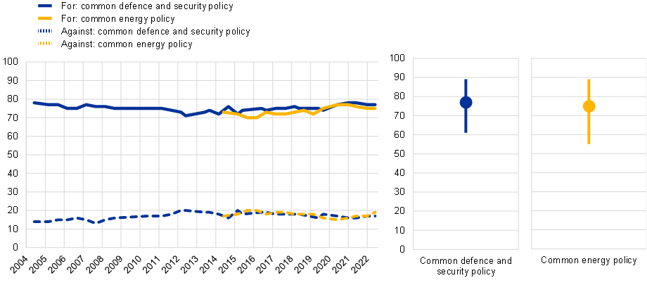 against it. [A common defence and security policy among EU Member States/A common energy policy among EU Member States]”. The results in panel b show the share of population stating that they are “For” in latest Standard Eurobarometer 97 with fieldwork performed in June-July 2022. The lines represent the range between the maximum and minimum shares in Member States.