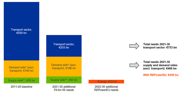 Notes: Fit-for-55 needs are based on the Commission’s MIX 55 scenario, which assumes carbon price signal extension to road transport and buildings and intensification of energy and transport policies for the EU to achieve 55% emissions cut by 2030. REPowerEU needs look at investments required to build an energy system that is independent from Russia as a fossil fuel producer. Additional green investment needs for wider environmental objectives (€150 billion per year in 2022 prices) are not shown in this chart.