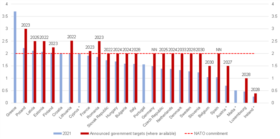 Source: Defence spending according to NATO data (NATO members) and SIPRI (non-NATO members). Targets according to media sources.