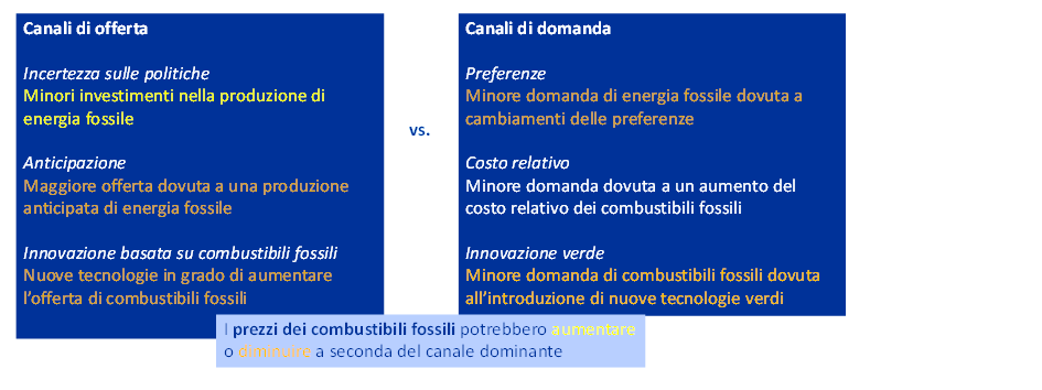Ma altri canali di offerta potrebbero invece determinare una riduzione dei prezzi. I produttori potrebbero ad esempio decidere di anticipare lo sfruttamento delle proprie riserve, dando luogo a un aumento dell’offerta e a un calo dei prezzi di combustibili fossili (“frontloading channel”)[12]. Effetti analoghi – ossia, maggiori investimenti e costi più bassi – potrebbero scaturire anche da innovazioni tecnologiche relative ai combustibili fossili, quali la cattura e il sequestro del carbonio (“brown innovation channel”)[13].