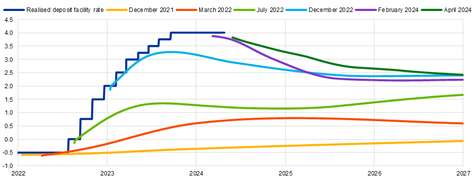 Notes: The cut-off dates for the data used for the €STR forward curves are 17 December 2021, 11 March 2022, 22 July 2022, 16 December 2022, 9 February 2024, and 29 April 2024.