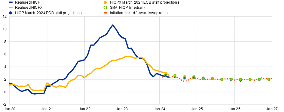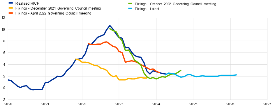 Notes: “Latest” refers to fixings with a cut-off date of 29 April 2024.The latest observations are for March 2024 for realised HICP (monthly data).