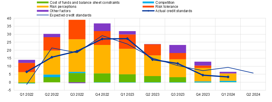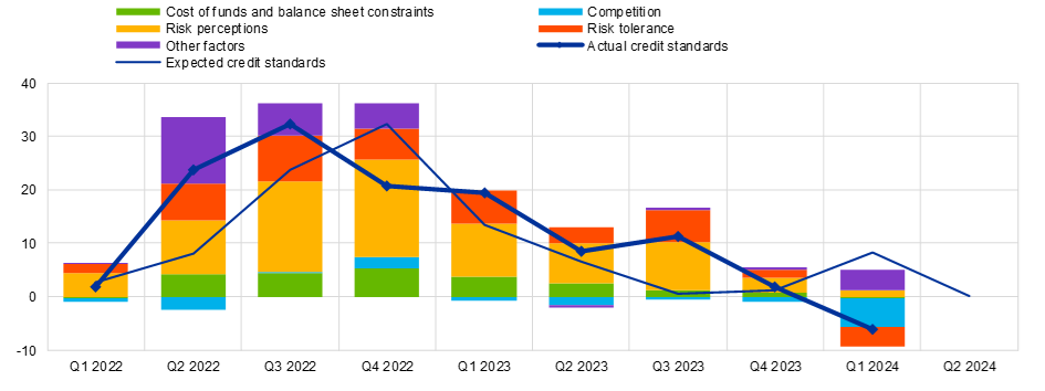 Notes: “Cost of funds and balance sheet constraints” is the unweighted average of “banks’ capital and the costs related to banks’ capital position”, “access to market financing” and “liquidity position”. “Risk perceptions” is the unweighted average of “general economic situation and outlook”, “industry or firm-specific situation and outlook/borrower’s creditworthiness” and “risk related to the collateral demanded”. “Competition” is the unweighted average of “competition from other banks”, “competition from non-banks” and “competition from market financing”. The net percentages for “Other factors” refer to an average of the further factors which were mentioned by banks as having contributed to changes in credit standards. The latest observations are for the first quarter of 2024.
