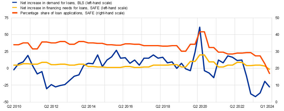 Notes: On the left-hand scale, for the BLS, a positive value is a net increase in loan demand at the bank; for the SAFE, a positive value is a net increase in the need of firms for bank loans. On the right-hand scale, the percentages shown are for firms that applied for a bank loan relative to firms for which bank loans are a relevant source of finance. The latest observations are for the first quarter of 2024.