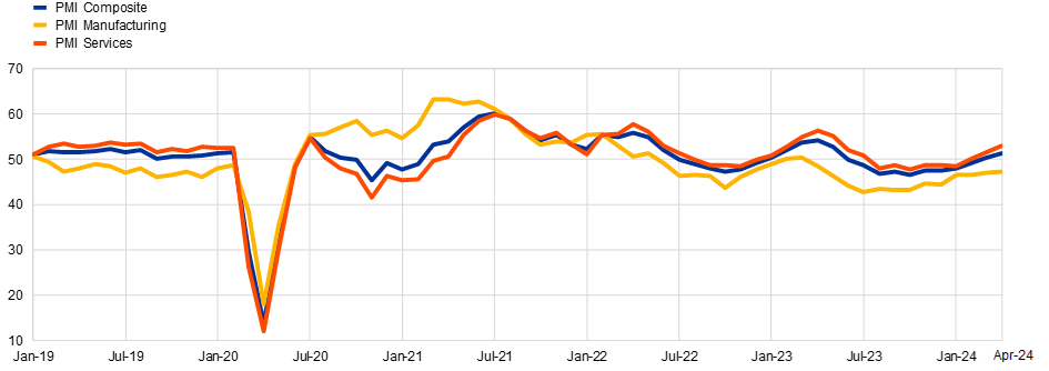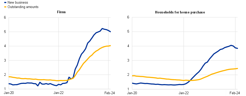 Note: Interest rates on new business for firms and households for house purchase refer to the indicator for the total cost of borrowing, which is calculated by aggregating short-term and long-term rates on new business using a 24-month moving average of new business volumes. The latest observations are for February 2024.