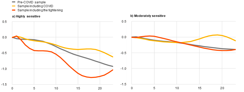 Notes: Impulse responses across individual items in the HICPX basket that are highly and moderately sensitive to monetary policy computed via smooth local projections (Barnichon, R. and Brownlees, C. (2019)) using the proxy for monetary policy shocks of Jarociński, M. and Karadi, P. (2020) estimated using the data set by Altavilla, C. et al. (2019), controlling for lags of the dependent variable, EuroStoxx index, industrial production, nominal effective exchange rate, oil prices, producer prices, as well as three-month and one-year Euribor rates. Estimation samples based on an expanding window approach are: (i) pre-COVID (December 2000-December 2019); (ii) including COVID (December 2000 – December 2021); and (iii) including monetary policy normalisation and tightening (December 2000 - September 2023). All impulse responses are normalised to 25 basis points increase in the monetary policy proxy.