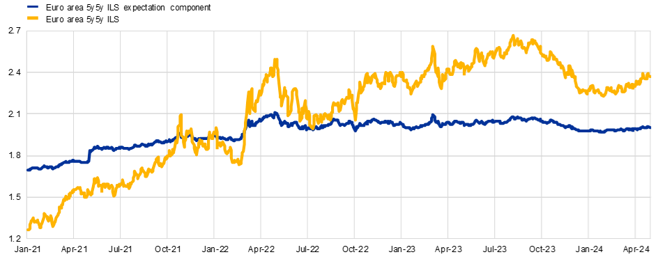 Notes: Premia-adjusted forward ILS rates are average estimates from two affine term structure models as in Joslin, S., Singleton, K. and Zhu, H. (2011) applied to ILS rates non-adjusted for the indexation lag; see Burban, V. et al. (2022), Economic Bulletin, Issue 8, 2021, Box 4, ECB. The latest observations are for 16 April 2024.