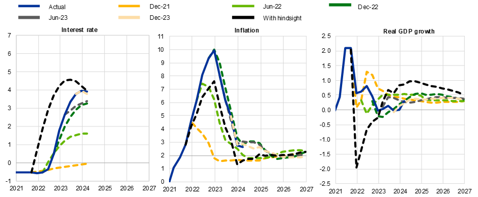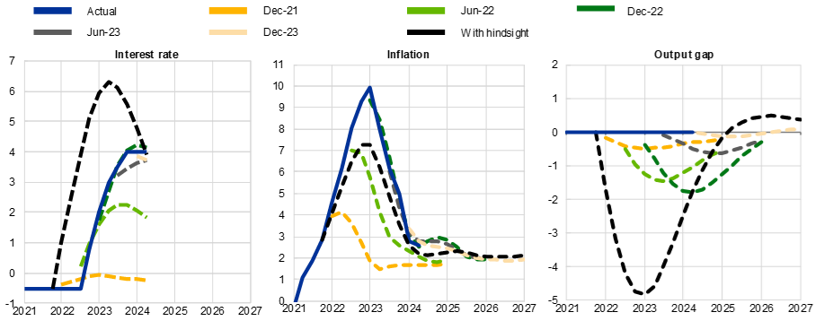 Notes: The optimal policy rate path simulations beyond the first quarter of 2024 are not shown for confidentiality reasons. “Actual” denotes historical data (DFR for the MMR model and €STR for the NAWM II). The other dashed lines on the left graph are a sequence of optimal policy counterfactuals computed in real time at each projection vintage from the fourth quarter of 2021 to the fourth quarter of 2023. The “With hindsight” lines denote the optimal policy counterfactual computed in the fourth quarter of 2021 with the benefit of hindsight by assuming that the same information that we now have on subsequent inflation and output developments and projections in the March 2024 ECB projections was already available in the fourth quarter of 2021. The middle and right panels show implied inflation and output gap respectively. For MMR: The output gap is in deviation from baseline output gap in the relevant vintage. For NAWM: The figure depicts the optimal policy counterfactuals carried out using the New Area Wide Model (NAWM) II (see Darracq Pariès, M., Kornprobst, A., and Priftis, R (2024)) at different points in time conditional on quarterly real-time macroeconomic projection baselines of the ECB between the fourth quarter of 2021 and the fourth quarter of 2023.