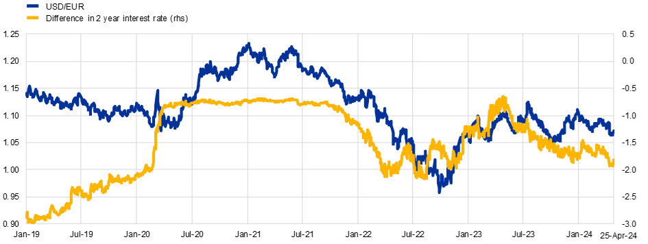 Chart 6: USD/EUR exchange rate and EA-US 2-year interest rate differential (based on OIS rates)