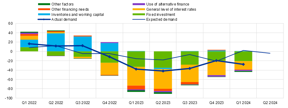 Notes: “Other financing needs” is the unweighted average of “mergers/acquisitions and corporate restructuring” and “debt refinancing/restructuring and renegotiation”. “Use of alternative finance” is the unweighted average of “internal financing”, “loans from other banks”, “loans from non-banks”, “issuance/redemption of debt securities” and “issuance/redemption of equity”. The net percentages for “Other factors” refer to an average of the further factors which were mentioned by banks as having contributed to changes in loan demand. The latest observations are for the first quarter of 2024.