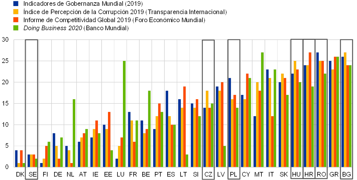 Además, en los países de la UE, el foco institucional solo ha adquirido relevancia analítica y en las políticas en los últimos años. Por tanto, en general, hay aún un amplio margen de mejora de las mediciones. Por último, no cabe duda de que los enfoques multipaís para abordar cuestiones tan complejas como la calidad institucional o el buen gobierno resultan en cierto modo insuficientes y es evidente que deben complementarse con evaluaciones más específicas de cada país y a más largo plazo. Asimismo, las dificultades de medición no deben llevar a restar importancia a estos determinantes fundamentales de la prosperidad, la justicia social y el bienestar a largo plazo.