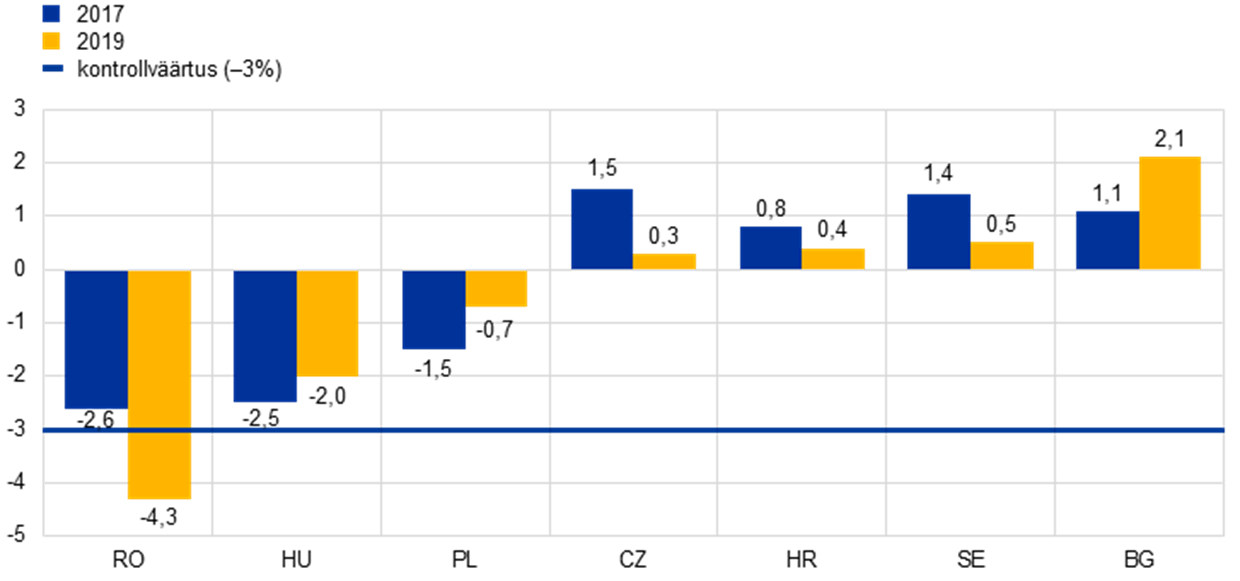 Vaatlusaluse riigi rahanduse arengu jätkusuutlikkuse hindamiseks vaadeldakse analüüsiaasta (2019) tulemit riigi viimase kümne aasta tulemuste valguses. Kõigepealt uuritakse eelarve puudujäägi suhtarvu arengut. Tasub meeles pidada, et riigi aastase eelarvepuudujäägi suhtarvu muutust mõjutavad tavaliselt mitmesugused tegurid. Neid võib jagada tsüklilisteks mõjuriteks, mis väljendavad eelarve puudujäägi reageerimist muutustele majandustsüklis, ja mittetsüklilisteks mõjuriteks, mis kajastavad üldjuhul eelarvepoliitika struktuurilisi või püsivaid kohandusi. Ent käesolevas aruandes esitatud mittetsüklilisi mõjureid ei saa siiski tingimata vaadelda üksnes eelarvepositsiooni struktuuriliste muutuste kajastajana, sest need hõlmavad veel nii poliitikameetmete kui ka eritegurite toimest tulenevat ajutist mõju eelarve tasakaalule. Tõepoolest, potentsiaalse kogutoodangu taseme ja kasvumäära suhtes valitsev ebakindlus teeb struktuursete eelarvepositsioonide COVID-19 pandeemiaaegsete muutuste hindamise vägagi keeruliseks.
