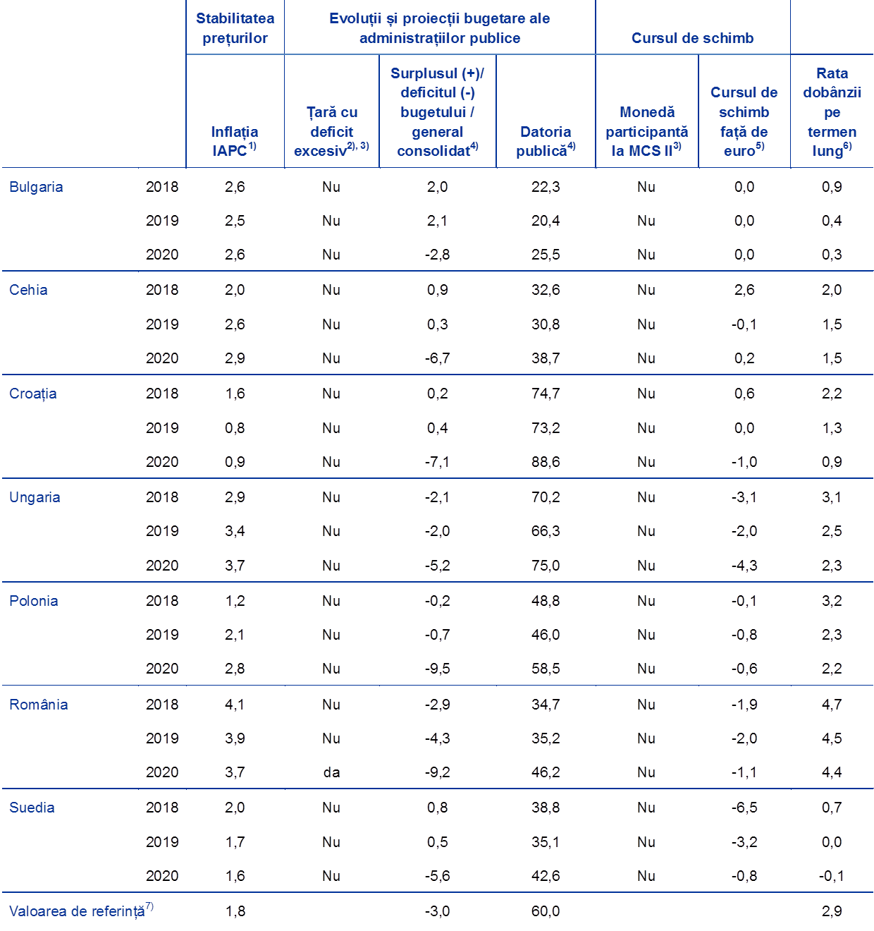 Data-limită pentru transmiterea datelor statistice incluse în actuala ediție a Raportului de convergență a fost 7 mai 2020. Datele statistice utilizate în aplicarea criteriilor de convergență au fost furnizate de Comisia Europeană (a se vedea Capitolul 6, precum și tabelele și graficele), în colaborare cu BCE în cazul cursurilor de schimb și al ratelor dobânzilor pe termen lung. Potrivit Comisiei Europene, perioada de referință corespunzătoare criteriului privind stabilitatea prețurilor este aprilie 2019 – martie 2020. În mod similar, perioada de referință pentru criteriul ratelor dobânzilor pe termen lung este tot aprilie 2019 – martie 2020. Perioada de referință pentru cursurile de schimb este 1 aprilie 2018 – 31 martie 2020. Datele istorice privind pozițiile fiscale acoperă intervalul până în anul 2019. De asemenea, sunt luate în considerare prognoze provenite din diverse surse, precum și cel mai recent program de convergență al statului membru analizat și alte informații considerate relevante pentru realizarea unei analize anticipative a caracterului sustenabil al procesului de convergență. Previziunile economice ale Comisiei Europene din primăvara anului 2020,[5] precum și Raportul privind mecanismul de alertă pentru anul 2020, luate în considerare în acest raport, au fost publicate la data de 6 mai 2020 și, respectiv, 17 decembrie 2019. [Raportul a fost aprobat de Consiliul general al BCE la data de 4 iunie 2020.]