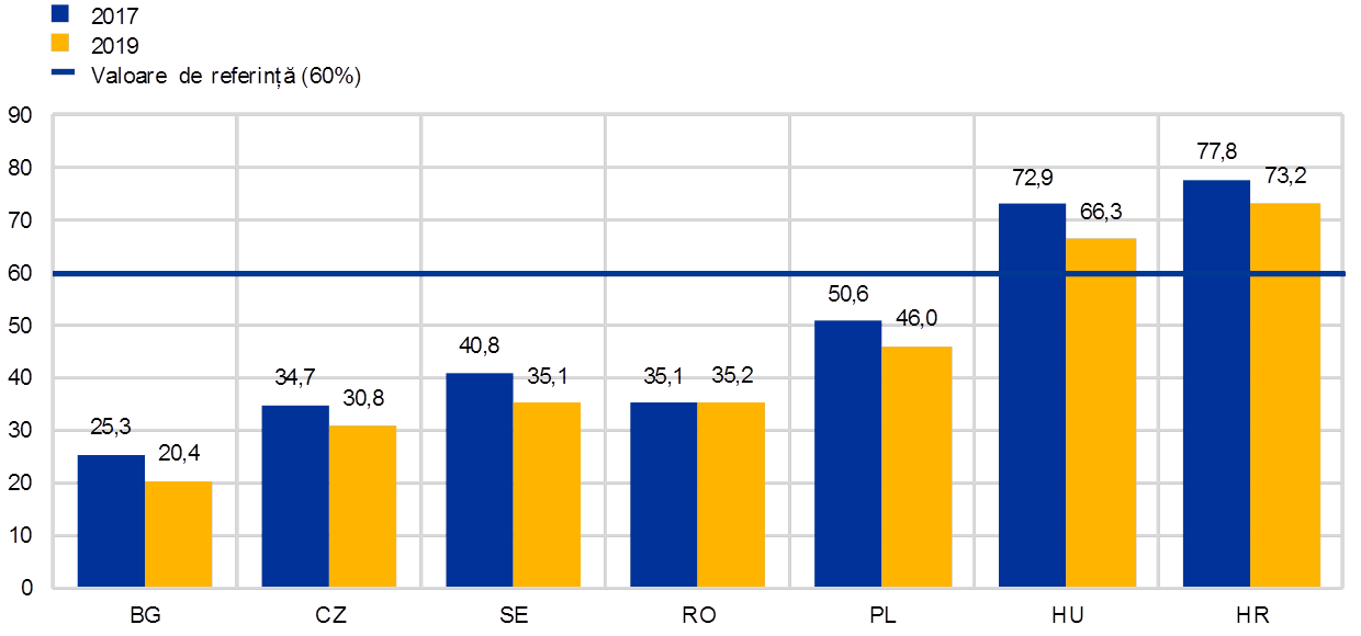 Referitor la prevederea Tratatului conform căreia ponderea datoriei publice în PIB care depășește 60% trebuie „să se diminueze suficient și să se apropie de valoarea de referință într-un ritm satisfăcător”, BCE examinează tendințele precedente și viitoare ale acestei ponderi. Pentru statele membre ale UE în care ponderea datoriei depășește valoarea de referință, BCE furnizează cea mai recentă evaluare a Comisiei Europene cu privire la respectarea valorii de referință aferentă reducerii ponderii datoriei în conformitate cu articolul 2 alineatul (1a) din Regulamentul (CE) nr. 1467/97.