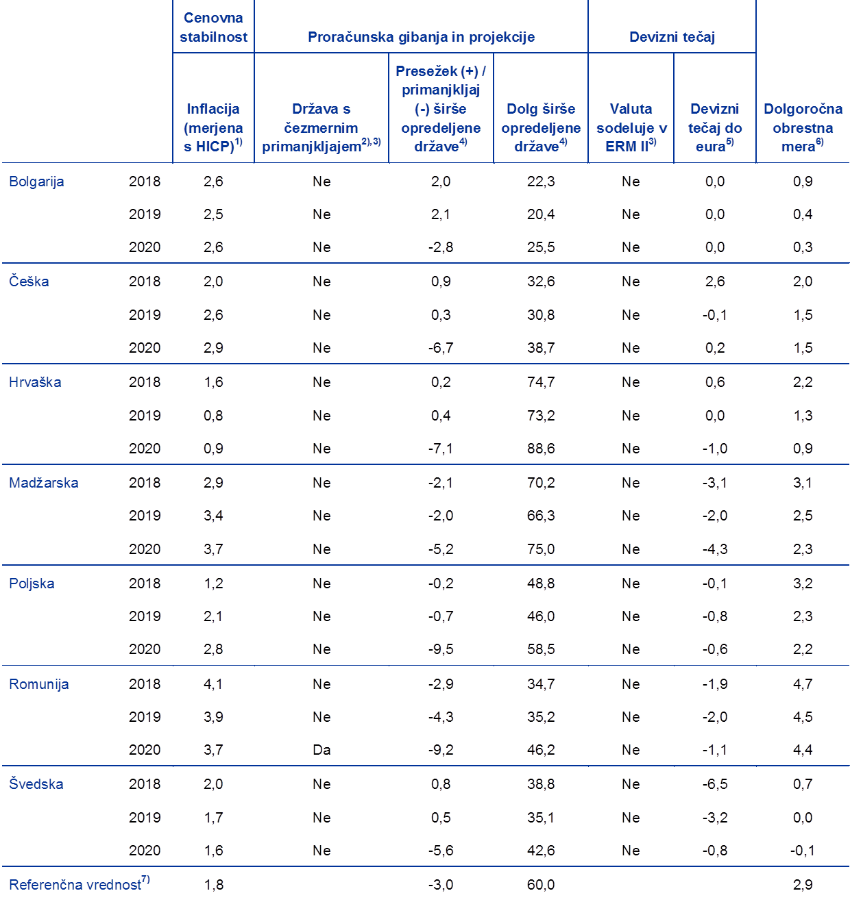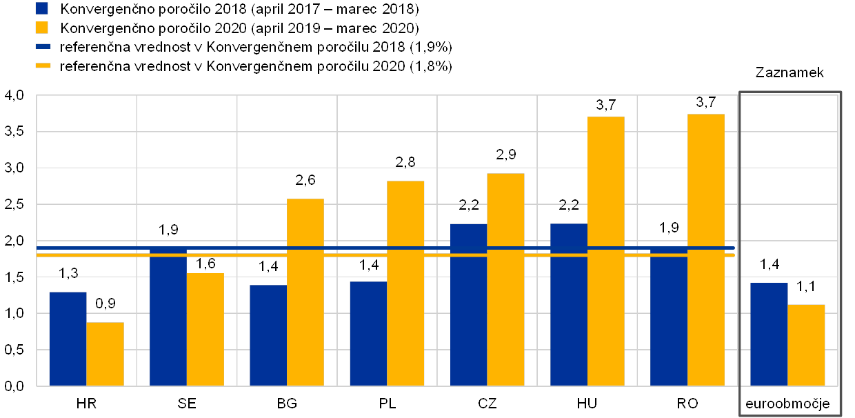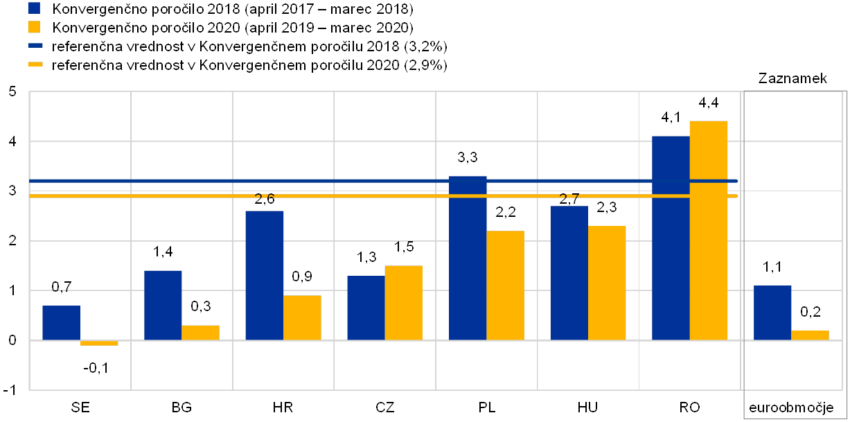 Presečni datum za statistične podatke v tem konvergenčnem poročilu je 7. maj 2020. Statistične podatke za oceno konvergenčnih kriterijev je zagotovila Evropska komisija (glej poglavje 6 ter tabele in grafe v angleški izdaji poročila), ki je v primeru deviznih tečajev in dolgoročnih obrestnih mer sodelovala z ECB. V dogovoru z Evropsko komisijo je referenčno obdobje za kriterij cenovne stabilnosti od aprila 2019 do marca 2020. Referenčno obdobje za kriterij dolgoročnih obrestnih mer je ravno tako od aprila 2019 do marca 2020. Referenčno obdobje za devizni tečaj pa je od 1. aprila 2018 do 31. marca 2020. Zgodovinski podatki o javnofinančnem položaju zajemajo obdobje do leta 2019. V poročilu so upoštevane tudi napovedi iz različnih virov in najnovejši konvergenčni program obravnavane države članice ter druge informacije, ki so pomembne pri preverjanju trajnosti konvergence v prihodnje. V tem poročilu sta upoštevana tudi letošnja pomladanska gospodarska napoved Evropske komisije,[5] objavljena 6. maja 2020, in poročilo Evropske komisije o mehanizmu opozarjanja za leto 2020, objavljeno 17. decembra 2019. Razširjeni svet ECB je poročilo sprejel 4. junija 2020.
