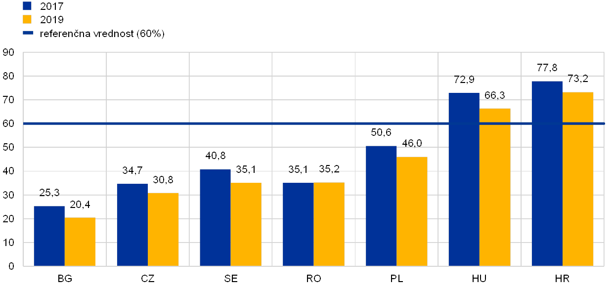 ECB v zvezi z določbo Pogodbe, da se mora delež javnega dolga v BDP, ki presega 60%, »zniževati zadosti in približevati dovolj hitro referenčni vrednosti«, pregleda pretekle in prihodnje trende v deležu dolga. Za države članice, v katerih delež javnega dolga presega referenčno vrednost, ECB poroča o zadnji oceni Evropske komisije glede skladnosti z referenčno vrednostjo za zmanjšanje dolga iz člena 2(1a) Uredbe (ES) št. 1467/97.