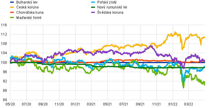 Táto správa sa vzťahuje na referenčné obdobie od 26. mája 2020 do 25. mája 2022. Všetky bilaterálne výmenné kurzy sú oficiálnymi referenčnými kurzmi ECB (viac v kapitole 6).