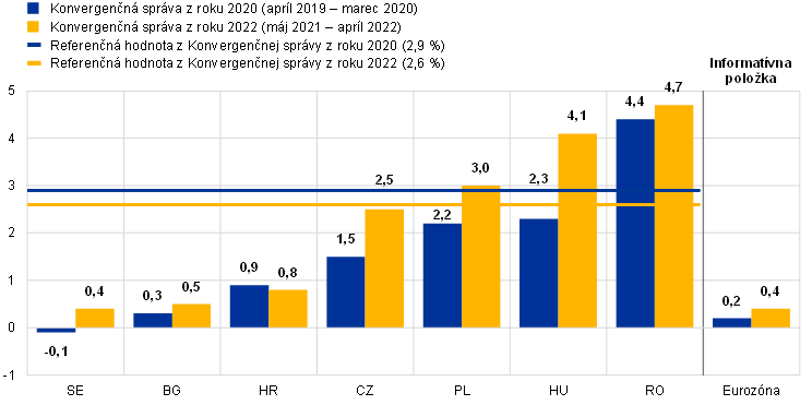 Z výpočtu referenčnej hodnoty bola vylúčená miera inflácie Malty a Portugalska. Výsledkom cenového vývoja v týchto krajinách v referenčnom období bola 12-mesačná priemerná miera inflácie zaznamenaná v apríli 2022 na úrovni 2,1 % a 2,6 %. Tieto dve krajiny boli z výpočtu referenčnej hodnoty vylúčené ako mimoriadne, keďže inflácia v oboch krajinách bola v referenčnom období oveľa nižšia ako v ostatných členských štátoch, pričom tento vývoj bol v oboch krajinách spôsobený výnimočnými faktormi. Tlmený vývoj inflácie na Malte vo veľkej miere odrážal stabilné ceny energií v dôsledku vládnej finančnej podpory štátnych energetických spoločností a zníženia spotrebnej dane z palív, ako aj technické faktory súvisiace s výpočtom indexu. V dôsledku pandémie COVID‑19 došlo v roku 2020 k výraznej, aj keď dočasnej zmene spotrebného koša domácností, čo v roku 2021 prinieslo veľkú zmenu váh niektorých položiek indexu. Tento trend bol obzvlášť výrazný v prípade inflácie v sektore služieb. V Portugalsku bol rozdiel v dynamike inflácie v porovnaní s eurozónou najmä výsledkom viac tlmeného rastu cien služieb aj energií. Zatiaľ čo pomalší rast cien služieb odráža vyšší vplyv zníženého dopytu po službách súvisiacich s cestovným ruchom, nižšie tempo rastu cien energií spôsobil nižší prenos zvýšenia medzinárodných cien ropy a ďalších nákladov na energie.[8]
