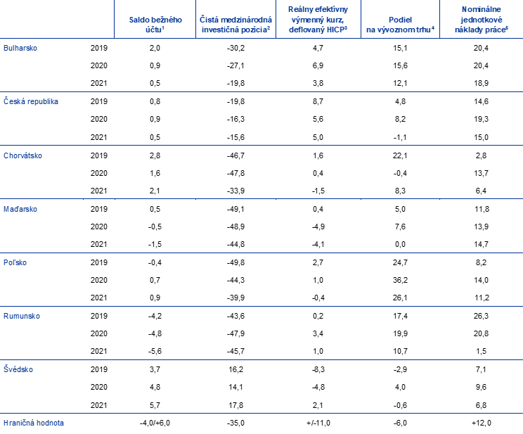 Ďalšie faktory, ktoré sa uvádzajú v článku 140 ods. 1 zmluvy, sa podobne ako v minulosti podrobne skúmajú v kapitole 5 v rámci hodnotenia jednotlivých kritérií opísaných v boxoch 1 až 4. Pre úplnosť sa v tretej kapitole uvádzajú ukazovatele hodnotiacej tabuľky (aj vo vzťahu k hraničným hodnotám pre včasné varovanie) za krajiny, ktorých sa táto správa týka. Zabezpečia sa tak všetky dostupné informácie potrebné na odhalenie makroekonomických a makrofinančných nerovnováh, ktoré môžu brániť dosiahnutiu vysokého stupňa udržateľnej konvergencie, ako sa uvádza v článku 140 ods. 1 zmluvy. Najmä členské štáty EÚ, pre ktoré platí výnimka a ktoré podliehajú postupu pri nadmernej nerovnováhe, možno len ťažko považovať za krajiny, ktoré dosiahli vysoký stupeň udržateľnej konvergencie v súlade s článkom 140 ods. 1 zmluvy.