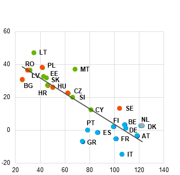 W kwietniu 2024 wszedł w życie zreformowany pakt stabilności i wzrostu, zmieniający zasady uruchamiania procedury nadmiernego deficytu opartej na zadłużeniu. Celem zreformowanych zasad jest ochrona stabilności długu publicznego i antycykliczności polityki fiskalnej, przyjęcie bardziej średniookresowego podejścia do polityki budżetowej oraz między innymi zwiększenie poczucia odpowiedzialności na szczeblu krajowym za ramy fiskalne. Zasady te zakładają również, że reformy, inwestycje i stabilność budżetowa mogą się wzajemnie wzmacniać i w związku z tym powinny być wspierane. Wreszcie, zasady mają na celu wzmocnienie procedury egzekwowania przepisów.[12] O ile zasady uruchamiania procedury nadmiernego deficytu opartej na deficycie pozostają zasadniczo niezmienione, o tyle zasady uruchamiania procedury nadmiernego deficytu opartej na kryterium długu zostały zmienione w sposób opisany w ramce 2. Jednakże w 2024 nie uruchomiono żadnych procedur nadmiernego deficytu opartych na długu na podstawie wyników z 2023, ponieważ krajowe plany fiskalno-strukturalne (stanowiące część zreformowanych ram fiskalnych UE) zostaną opublikowane dopiero jesienią 2024 i będą obejmowały strategie fiskalne na rok 2025.