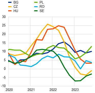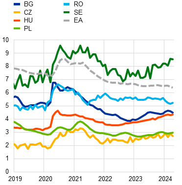 Należy zauważyć, że możliwe byłoby również uznanie Belgii i Danii za kraje nietypowe, zważywszy, że 12-miesięczne średnie stopy inflacji w tych krajach były znacznie niższe od średniej dla strefy euro w maju 2024 (odpowiednio o 1,5 i 2,3 pkt proc.). Znaczna różnica w dynamice inflacji tych krajów w stosunku do strefy euro wynikała głównie z silniejszych spadków cen energii (składowa „energia" wskaźnika HICP) ze względu na szybszy wpływ hurtowych cen energii na ceny detaliczne, co przede wszystkim odzwierciedlało szczególne cechy kontraktów energetycznych.