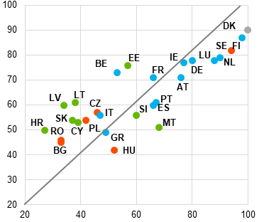 W niniejszym raporcie EBC nie uznaje Belgii i Danii za kraje nietypowe, ponieważ nie traktuje różnic dotyczących wpływu międzynarodowych cen energii na ceny energii w poszczególnych krajach jako czynników wyjątkowych, o ile odzwierciedlają one różnice strukturalne między rynkami energii w państwach członkowskich. Określenie państw członkowskich o najlepszych wynikach na potrzeby Raportu o konwergencji z czerwca 2024 nie ma wpływu na przygotowanie przyszłych raportów o konwergencji.