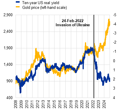 Notes: In panel a), “Ten-year US real yield” indicates the market yield on inflation-indexed US Treasury securities with a ten-year constant maturity. The latest observations are for 31 December 2024. In panel b), active gold diversifiers are identified as countries that increased the share of gold in their official foreign reserves by more than the cross-country average change. The geopolitical index used in the chart measures the distance in 2022 of a country from China-Russia compared with the United States. A higher value indicates that a country is geopolitically closer to China-Russia than to the United States. See Special feature A, “Geopolitical fragmentation risks and international currencies”, in the 2023 edition of this report.