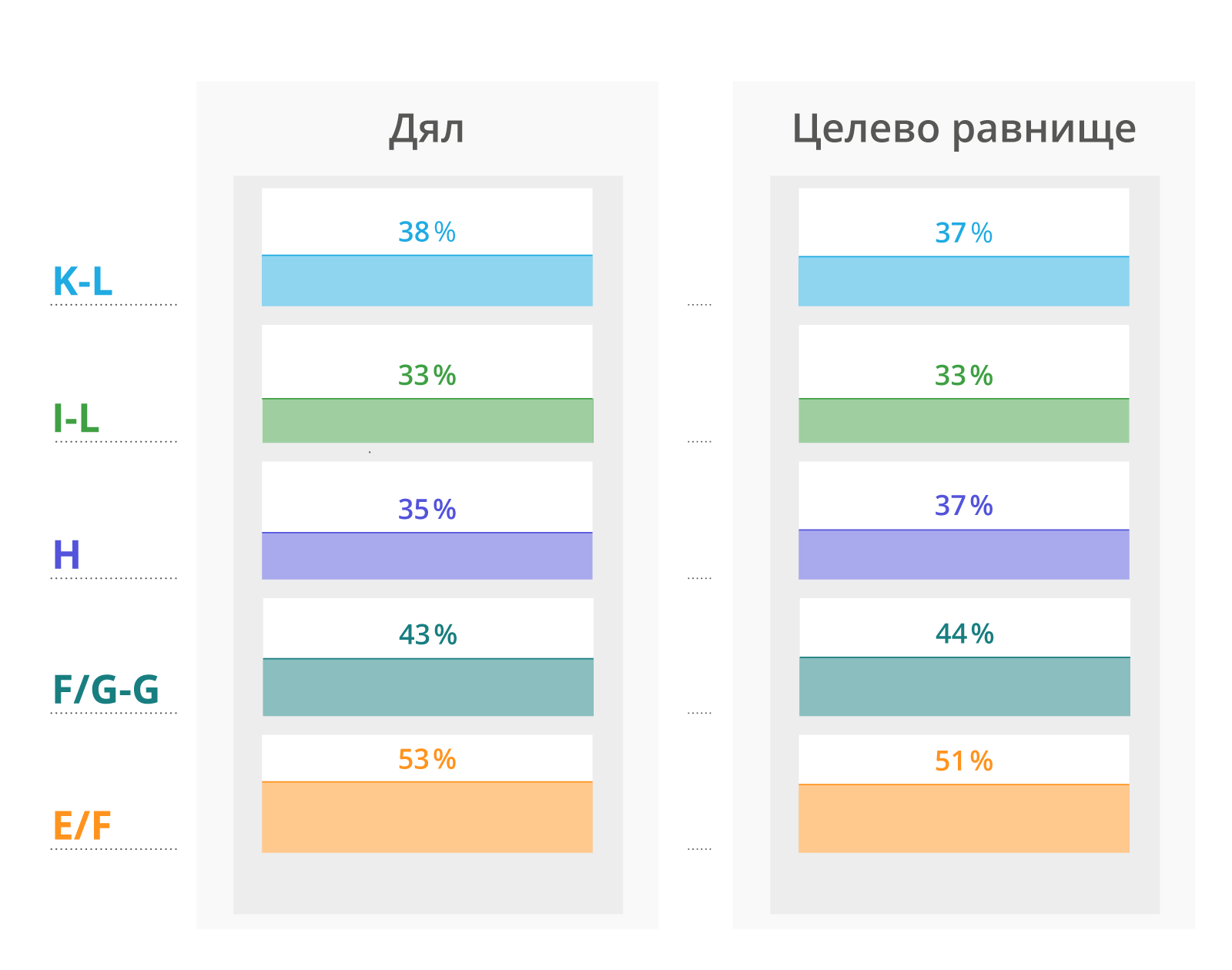 - Делът на жените на висши и средни ръководни позиции и на начално ниво (анализатори) съответства на междинните цели