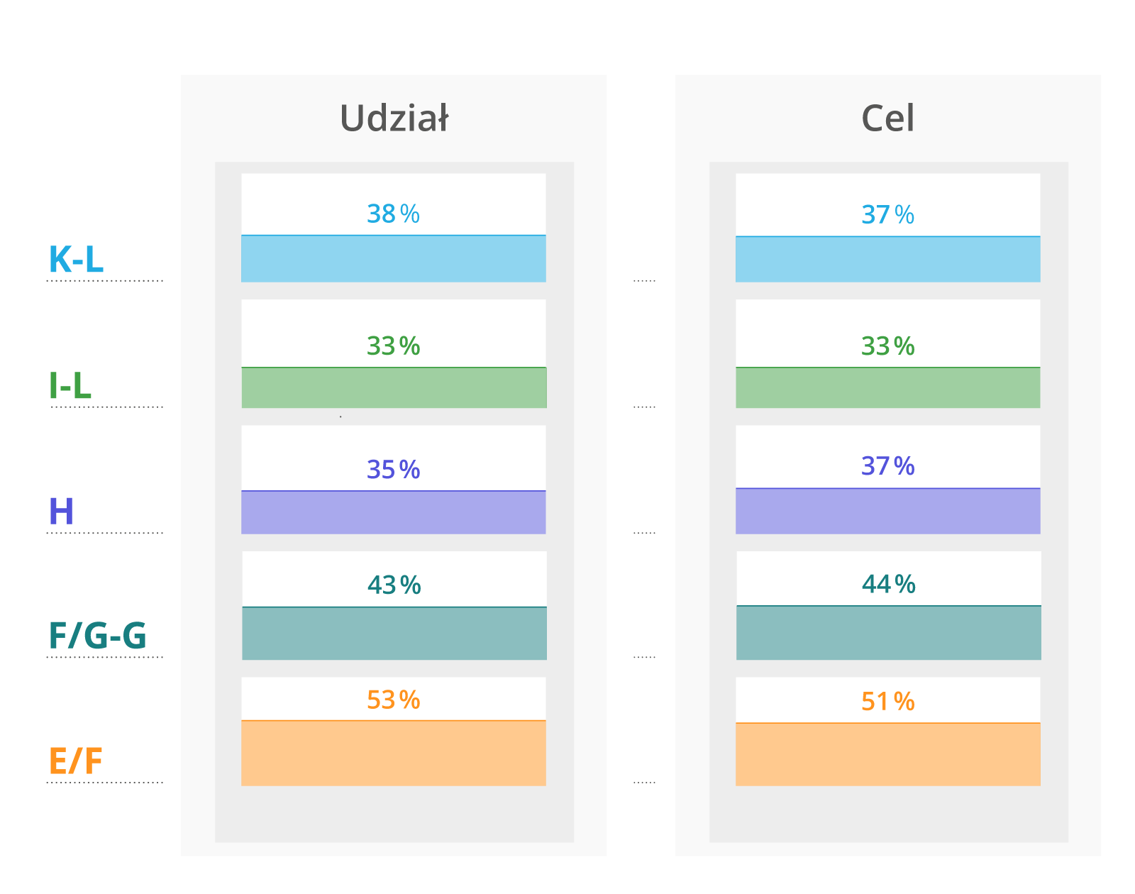 • Udział kobiet na najwyższych stanowiskach (kierownictwo wyższego i średniego szczebla) oraz stanowiskach początkowych (analitycy) jest zgodny z celami pośrednimi.