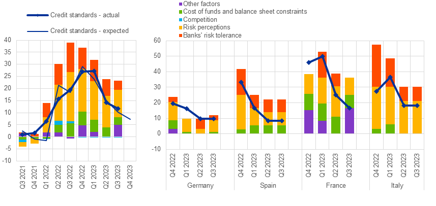 According to the October 2023 euro area bank lending survey (BLS), credit standards – i.e. internal guidelines or loan approval criteria of banks – for loans or credit lines to enterprises tightened further in the third quarter of 2023 (net percentage of banks of 12%, after 14% in Q2 2023; Chart 1). Cumulative net tightening since 2022 has been substantial, which is consistent with the ongoing significant weakening in lending dynamics. The net percentage of banks reporting a tightening moderated slightly compared with the previous quarter but was slightly higher than banks had expected in the previous quarter. Banks also reported a further net tightening of their credit standards for loans to households for house purchase and consumer credit and other lending to households (net percentages of 11% and 16% respectively). In both cases this strongly exceeded previous expectations. The pace of net tightening for housing loans even picked up compared with the second quarter, while it moderated slightly for consumer credit and other lending. Higher risk perceptions related to the economic outlook and borrower-specific situation, lower risk tolerance and lower liquidity positions of banks contributed to the tightening. For the fourth quarter of 2023, euro area banks expect a further, albeit more moderate, net tightening of credit standards on loans to firms, and broadly unchanged credit standards on loans to households for house purchase. For consumer credit, euro area banks expect a further significant net tightening.