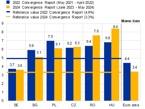 As regards the price stability criterion, five of the countries under review – Bulgaria, the Czech Republic, Hungary, Poland and Romania – recorded average inflation rates well above the reference value of 3.3%, while inflation was slightly above the reference value in Sweden (Chart 1). The reference value is based on the three best-performing Member States over the past 12 months, i.e. Denmark (1.1%), Belgium (1.9%) and the Netherlands (2.5%), taking their average inflation rates over the past 12 months and adding 1½ percentage points. One outlier, Finland, was excluded from this calculation.