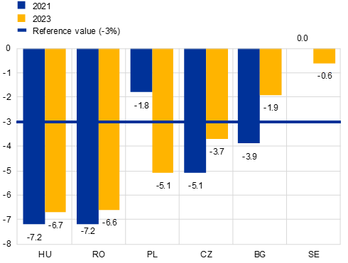 The fiscal deficit in 2023 improved compared with its 2021 level in four of the countries covered in this report, owing to the post-pandemic economic recovery and the phasing-out of fiscal support measures. However, this improvement was in part curbed by the economic impact of Russia’s war against Ukraine, including weaker economic activity, and fiscal policy measures taken in response to high energy prices. In 2023 the Czech Republic, Hungary, Poland and Romania exceeded the deficit reference value of 3% of GDP (Chart 2). The government debt-to-GDP ratio in 2023 was below the reference value of 60% in all of the countries under review except Hungary. In 2024 and 2025 the budget balance is expected to continue to exceed the reference value in Hungary, Poland and Romania.