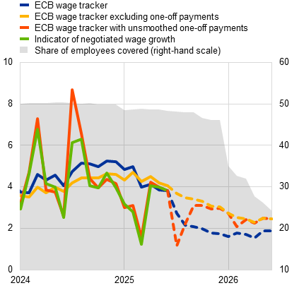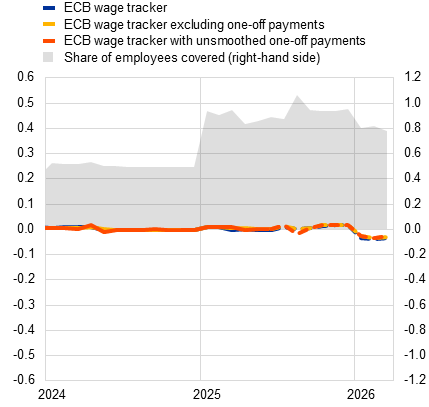 For the first half of 2026, the headline ECB wage tracker stands at 1.7% (down from 2.1% in the second half of 2025 and 4.3% in the first half of 2025), the ECB wage tracker with unsmoothed one-off payments stands at 2.4% (down from 2.6% in the second half of 2025 and from 3.3% in the first half of 2025), and the ECB wage tracker excluding one-off payments stands at 2.5% (down from 3.3% in the second half of 2025 and 4.3% in the first half of 2025). The employee coverage in the first half of 2026 stands at 29.7% (33.3% in the first quarter and 26.0% in the second quarter), down from the 46.3% recorded for the fourth quarter of 2025. The signals from the ECB wage tracker for the first half of 2026 are expected to become more complete as new wage agreements are signed, pushing up the employee coverage indicator from its current relatively low levels. See Chart 1 and Table 1 for further details.