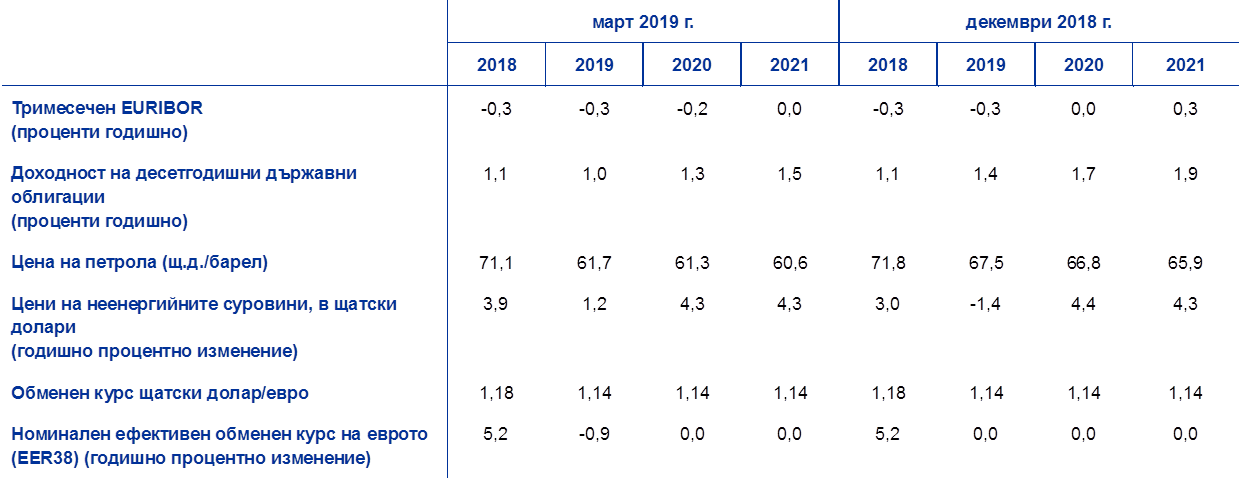 В сравнение с прогнозите от декември 2018 г. техническите допускания включват по-ниски цени на петрола, по-слаб ефективен обменен курс на еврото и по-ниски лихвени проценти. Техническите допускания за лихвените проценти и за цените на суровините се основават на пазарните очаквания към 12 февруари 2019 г. (крайна дата). Краткосрочните лихвени проценти се отнасят до тримесечния EURIBOR, като пазарните очаквания се извеждат от фючърсните лихви. Според този метод средното равнище на тези краткосрочни лихвени проценти е -0,3% за 2019 г., -0,2% за 2020 г. и 0,0% за 2021 г. Пазарните очаквания за номиналната доходност на 10-годишните държавни облигации в еврозоната са за средно равнище от 1,0% през 2019 г., 1,3% през 2020 г. и 1,5% през 2021 г.[2] В сравнение с прогнозите от декември 2018 г. пазарните очаквания за краткосрочните лихвени проценти са ревизирани надолу с 2 базисни пункта за 2019 г., 17 базисни пункта за 2020 г. и 31 базисни пункта за 2021 г., а за дългосрочните са ревизирани надолу с около 40 базисни пункта за целия прогнозен период.