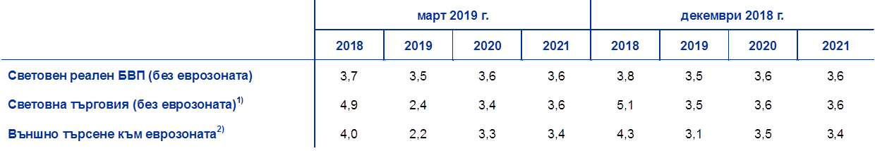 Очаква се забавянето на промишленото производство в световен план, изострянето на търговското напрежение и отслабването на технологичния цикъл в Азия да окажат потискащо действие върху световната търговия през тази година, което предполага по-изразено забавяне на търговията в световен план, отколкото на икономическата активност. В по-далечна перспектива прогнозите за световната търговия са обвързани с преценката, че световният внос ще нараства в общи линии в синхрон с икономическата активност. Външното търсене към еврозоната, което нарасна с 4% през 2018 г., се очаква да се забави съществено, спадайки до 2,2% през 2019 г., след което да се засили до 3,3% и 3,4% съответно през 2020 г. и 2021 г. В сравнение с прогнозите от декември 2018 г. външното търсене към еврозоната е ревизирано отчетливо надолу за 2019 г. и в по-малка степен за 2020 г., като цяло в отражение на слабите данни от края на 2018 г. и прогнозираното по-слабо търсене на внос от страна на Китай, останалите азиатски възникващи пазари и европейските икономики извън еврозоната.