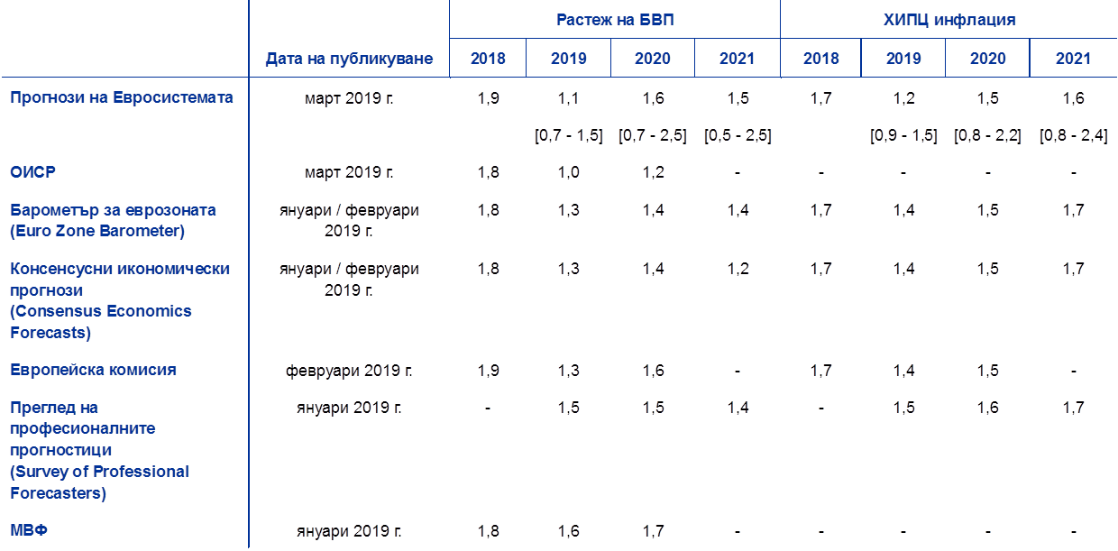 Източници: Междинни икономически прогнози на ОИСР – март 2019 г.; MJEconomics за Барометър на еврозоната – проучване от февруари 2019 г. за 2018 г., 2019 г., и 2020 г. и проучване от януари 2019 г. за 2021 г.; Консенсусни икономически прогнози – проучване от февруари 2019 г. за 2018 г., 2019 г. и 2020 г., проучване от февруари 2019 г. на тема „Тенденции в производителността и заплатите за 2021 г. (БВП)“ и проучване от януари 2019 г. за 2021 г. (ХИПЦ); Икономическа прогноза на Европейската комисия, зима 2019 г. (междинна) Европейска икономическа прогноза; ЕЦБ – Преглед на професионалните прогностици, първо тримесечие на 2019 г.; МВФ: Перспективи за световната икономика, актуализация януари 2019 г.