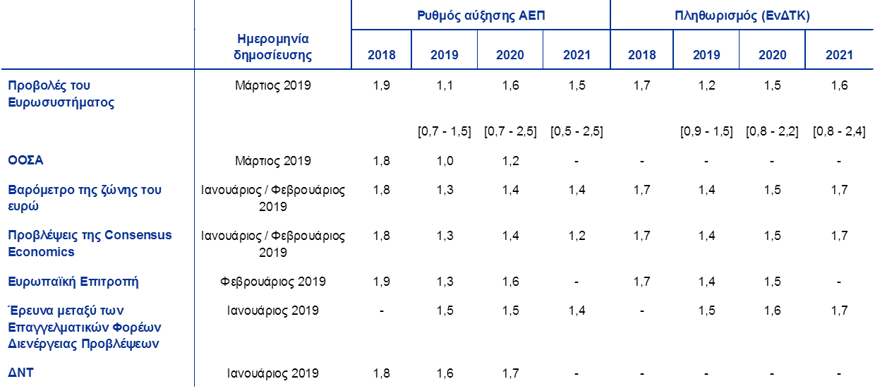 Πηγές: ΟΟΣΑ, Interim Economic Outlook, Μάρτιος 2019· MJEconomics για το Βαρόμετρο της Ζώνης του Ευρώ, έρευνα του Φεβρουαρίου 2019 για το 2018, 2019, 2020 και έρευνα του Ιανουαρίου 2019 για το 2021· Προβλέψεις της Consensus Economics, έρευνα του Φεβρουαρίου 2019 για το 2018, 2019, 2020 και έρευνα του Φεβρουαρίου 2019 σχετικά με τις τάσεις της παραγωγικότητας και των μισθών για το 2021 (ΑΕΠ) και έρευνα του Ιανουαρίου 2019 για το 2021 (ΕνΔΤΚ)· Οικονομικές Προβλέψεις της Ευρωπαϊκής Επιτροπής, (Ενδιάμεσες) Ευρωπαϊκές Οικονομικές Προβλέψεις, Χειμώνας 2019· Έρευνα της ΕΚΤ μεταξύ των Επαγγελματικών Φορέων Διενέργειας Προβλέψεων, Α΄ Τρίμηνο 2019· ΔΝΤ, World Economic Outlook, επικαιροποίηση Ιανουαρίου 2019.