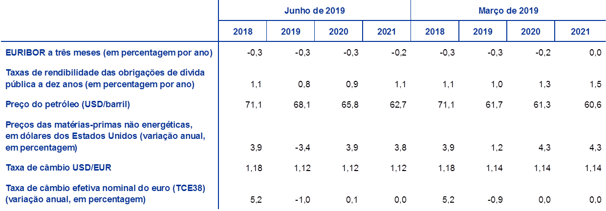 Em comparação com as projeções de março de 2019, os pressupostos técnicos incluem preços do petróleo mais altos e taxas de juro mais baixas. Os pressupostos técnicos relativos às taxas de juro e aos preços das matérias-primas têm por base as expetativas do mercado, com uma data de fecho da informação de 15 de maio de 2019. As taxas de curto prazo referem-se à EURIBOR a três meses, sendo as expetativas do mercado determinadas a partir das taxas dos contratos de futuros. Seguindo esta metodologia, obtém-se para estas taxas de juro de curto prazo um nível médio de −0,3% em 2019 e 2020 e de −0,2% em 2021. As expetativas do mercado quanto às taxas de rendibilidade nominais das obrigações de dívida pública a dez anos na área do euro implicam um nível médio de 0,8% em 2019, 0,9% em 2020 e 1,1% em 2021[2]. Em comparação com as projeções de março de 2019, as expetativas do mercado em relação às taxas de juro de curto prazo foram objeto de uma revisão em baixa de cerca de 10 pontos base para 2020 e em torno de 20 pontos base para 2021, ao passo que as taxas de rendibilidade nominais das obrigações de dívida pública a dez anos na área do euro foram revistas em baixa em torno de 30 pontos base para 2019 e 2020 e em cerca de 40 pontos base para 2021.