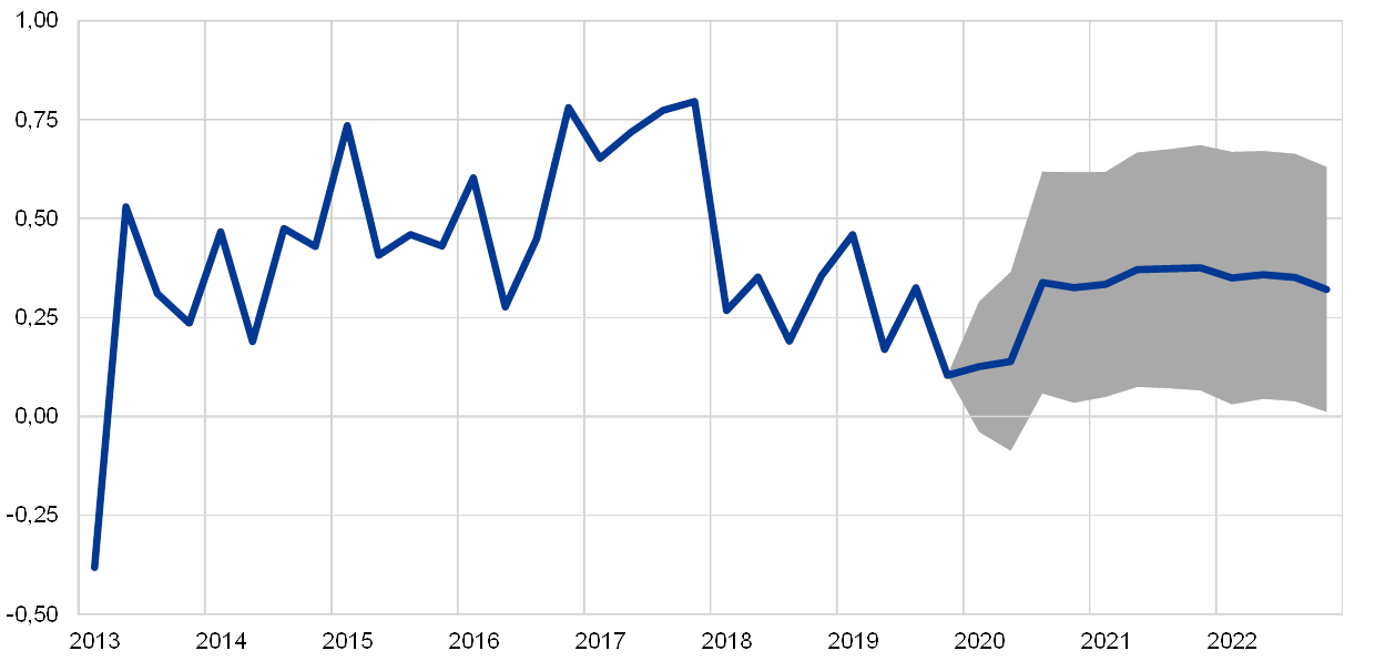 Rispetto alle proiezioni di dicembre, il tasso di incremento del PIL in termini reali è stato rivisto verso il basso di 0,3 e 0,1 punti percentuali, rispettivamente, nel 2020 e nel 2021. La correzione al ribasso dell’attività per il 2020 rispecchia un lieve effetto di trascinamento derivante dalla crescita inferiore alle attese nel quarto trimestre del 2019, la debolezza più prolungata del previsto nel settore manifatturiero e in particolare l’impatto sfavorevole atteso della pandemia di COVID-19. Il minore ritmo di espansione nel 2020 implica un lieve effetto di trascinamento negativo nel 2021.